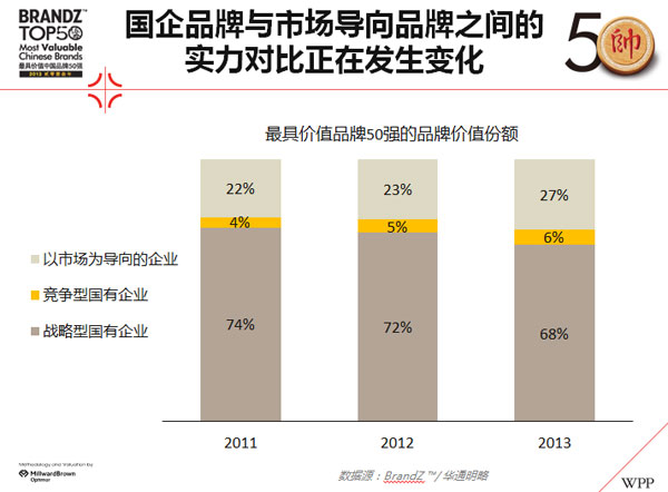 非国有企业在品牌50强中所占比例从2011年的22%升至27%。