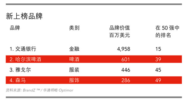 今年的50强排行榜中出现了四个新品牌。交通银行首次跻身50强,名列第15位,该行成功上榜一方面是得益于金融和品牌因素,另一个关键因素是,其20%的收入均来自零售银行业务——这正是50强排名的重要参评标准。啤酒品牌哈尔滨啤酒名列第39位,该品牌将广告与重量级体育赛事联系到一起,在竞争激烈的啤酒行业另辟蹊径、独创一格。另外两个新成员雅戈尔和森马均为服装品牌,分列第45和49位。随着消费者的口味逐渐转向更显优雅的服装,雅戈尔顺势而上、大获其益;而森马则继续主攻青少年市场,同时还大力投资零售网点及供应链。