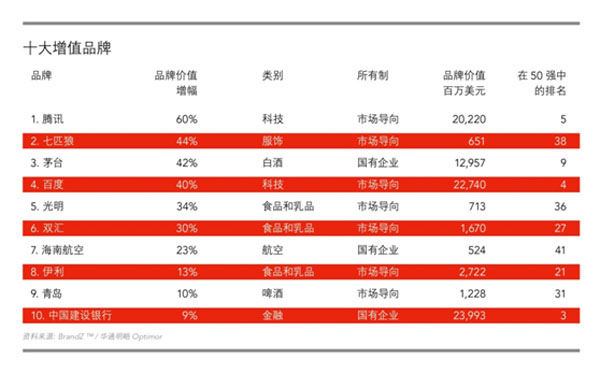 同时随着中国消费者在互联网和移动平台上投入更多的时间和金钱,中国科技品牌也取得了大幅增长。百度上升了两位排名第四;借助于微信这类依托于移动互联网产品地崛起,腾讯从第十名升至第五名,成为榜单中品牌价值增长最快的品牌。相反,人人网的品牌价值与去年相比则下跌77%位列榜单最末。